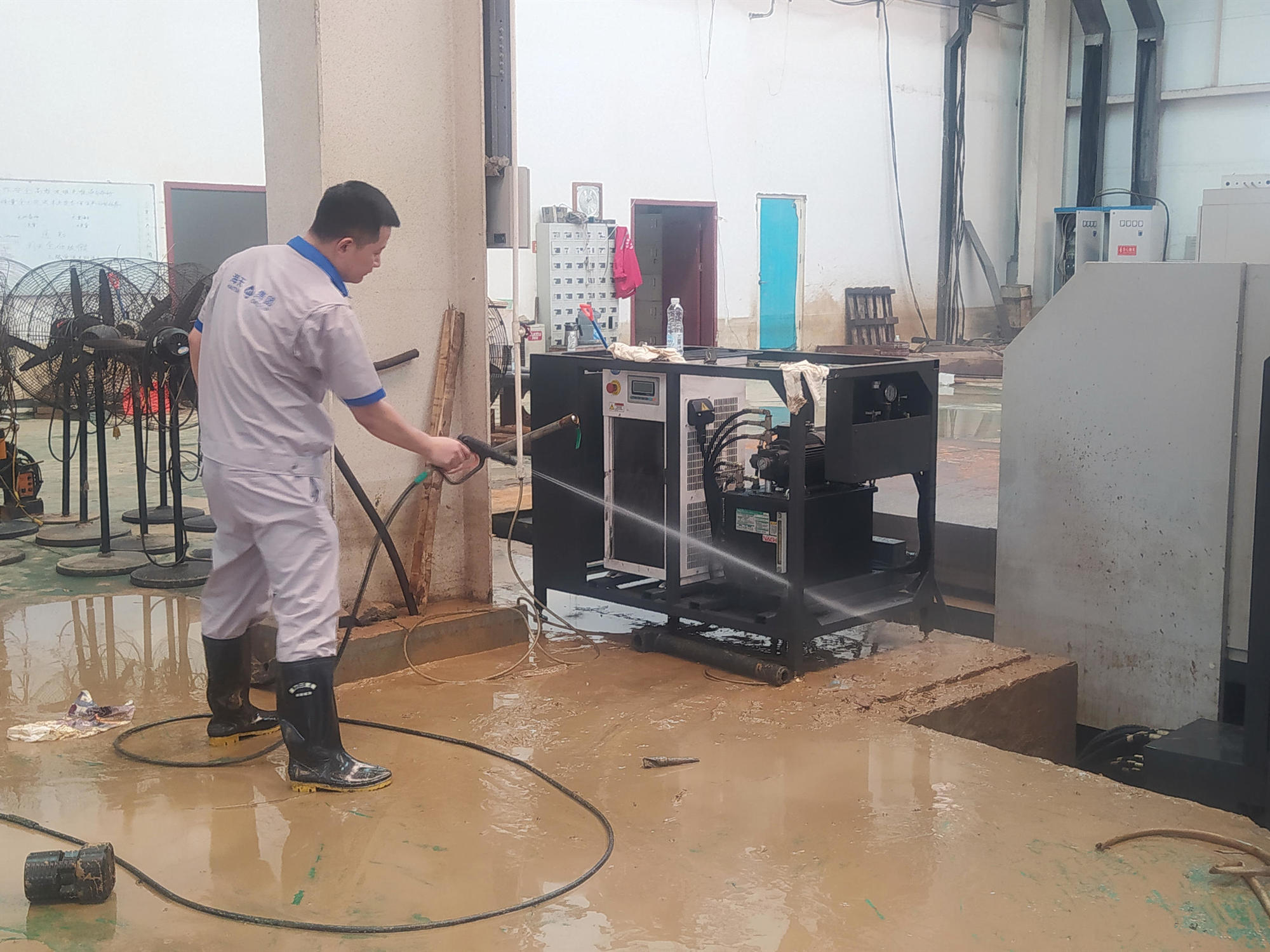 搶修隊伍來到客戶現場后,發現設備均有不同程度的受損,有些甚至被水浸泡太久已無法使用。售后人員對受災設備進行逐一排查,針對床身、排屑器、水箱、電柜箱等部位進行了清理。針對線軌,絲杠,軸承等部件進行清洗并上油做防銹處理。對于受損零配件進行了更換。現場無法處理的裝置已送專業檢測機構檢測、修復。經過搶修,機床逐步恢復使用。