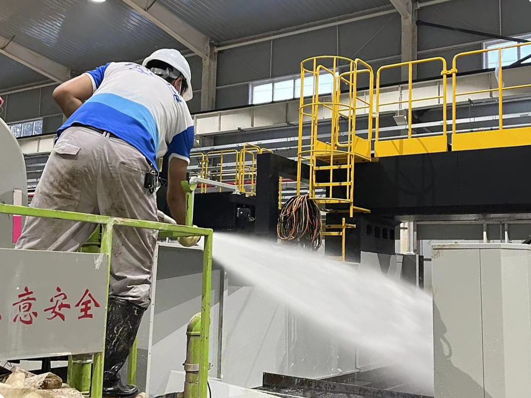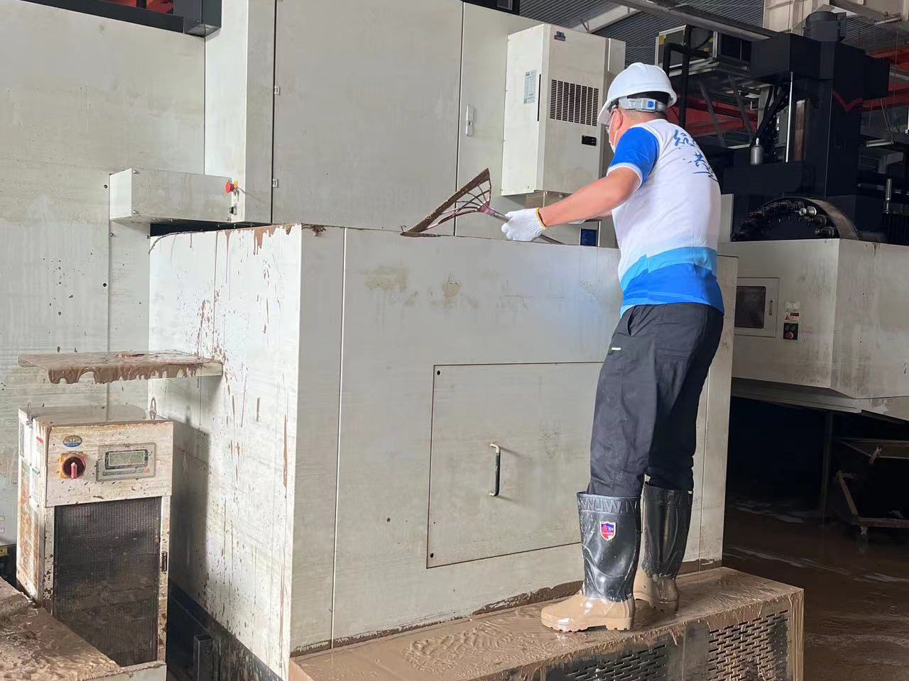 搶修隊(duì)伍克服困難來到現(xiàn)場后,發(fā)現(xiàn)設(shè)備受損情況相當(dāng)嚴(yán)重,除了淤泥沉積,有些甚至被水浸泡太久已無法使用。在缺水缺電的情況下,售后人員用發(fā)電機(jī)及水炮車進(jìn)行作業(yè),對受災(zāi)設(shè)備進(jìn)行逐一排查,開展清淤、排污等災(zāi)后修復(fù)工作。針對床身、排屑器、水箱、電柜箱等部位進(jìn)行了清理。針對線軌,絲杠,軸承等部件進(jìn)行清潔并做防銹處理。對于受損零配件進(jìn)行了搶修拆卸。現(xiàn)場無法處理的裝置轉(zhuǎn)送專業(yè)機(jī)構(gòu)檢測、修復(fù)。
