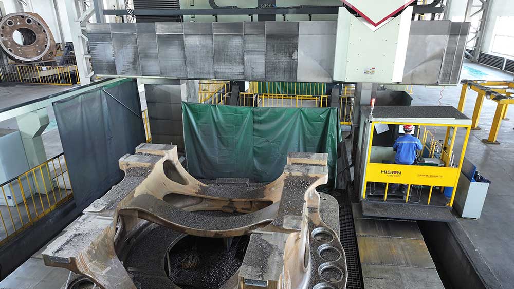甘肅日月主要生產(chǎn)配套陸上風(fēng)機(jī),包括風(fēng)機(jī)的輪轂和底座,這就要求機(jī)床具備高剛性、強(qiáng)力切削、加工范圍廣的特性。廠區(qū)內(nèi)8臺海天精工大型重型龍門加工中心擁有超寬方滑枕、6米門寬,像穩(wěn)固的磐石使加工過程運(yùn)行穩(wěn)定。甘肅日月生產(chǎn)副廠長蔡安強(qiáng)對此表達(dá)了贊賞:“海天精工龍門的滑枕寬度比一般的都大,達(dá)到了500×500,完全滿足切削的剛性要求。”